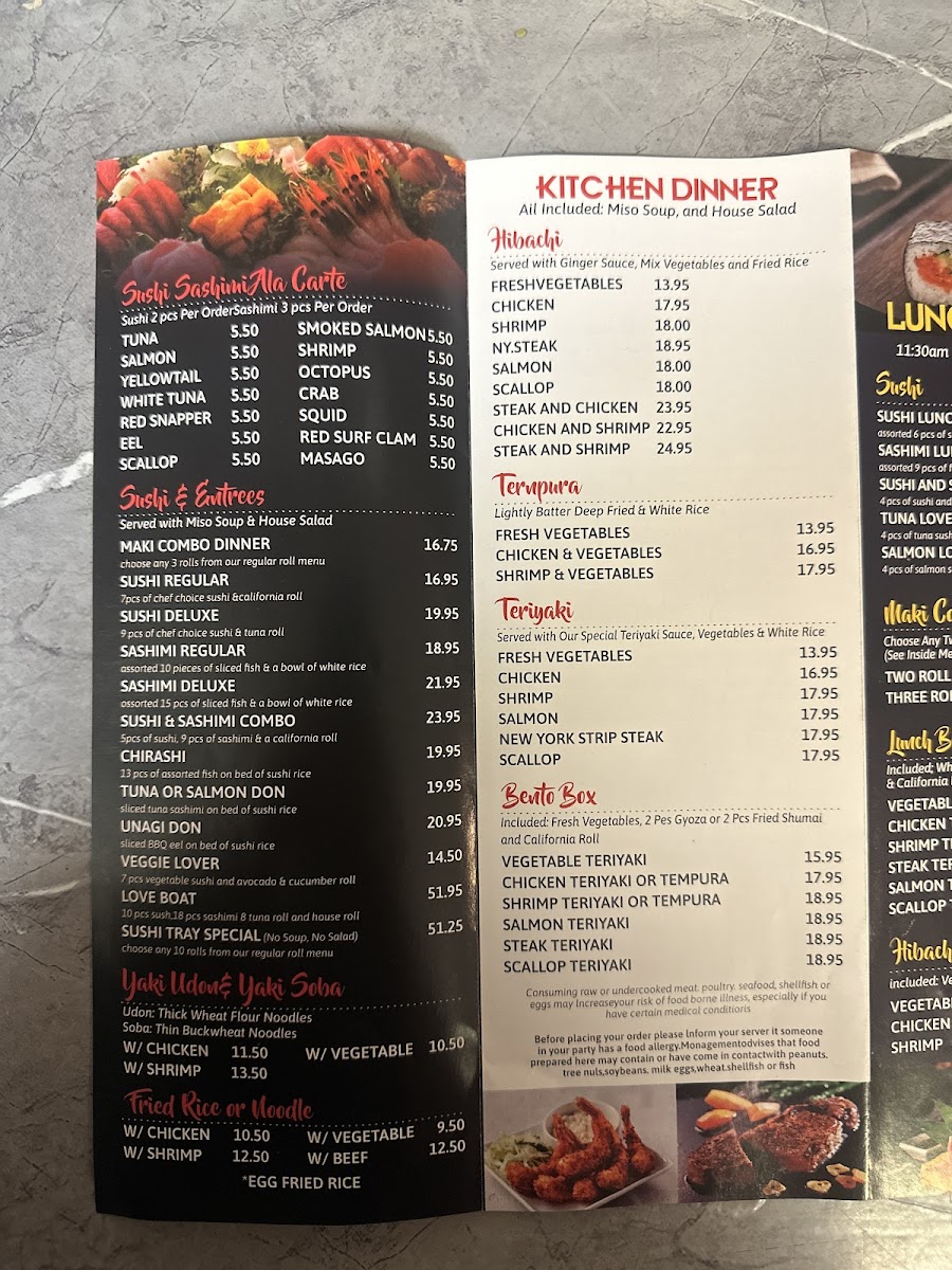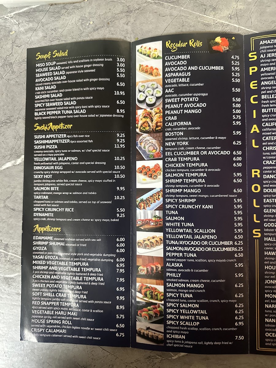 The menu offers an impressive array of regular rolls, such as the California Roll and Sweet Potato Roll, with prices starting at just $3.50. For a heartier option, explore their teriyaki entrees, including savory chicken and succulent steak, each served with miso soup, house salad, and white rice.